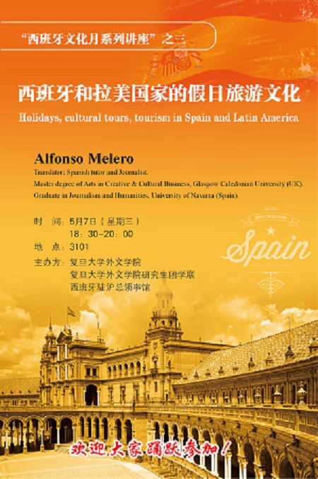 由外文学院和西班牙驻沪总领事馆主办的西班牙文化月活动持续火热袭来,接下来推出系列讲座的第三场: “西班牙和拉美国家的假日旅游文化”, 主讲人是毕业于西班牙纳瓦拉大学新闻学的Alfonso Melero, 5月7日(周三)18:30邯郸校区三教3101,欢迎对西班牙或拉美文化感兴趣的同学前来参与!
