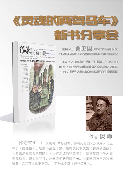 2014年5月6日下午,外文学院读书会之《灵魂的两架马车》在文科楼220召开。读书会以分享英文系谈峥教授在《作家》(第538期)杂志上发表的长篇小说《灵魂的两架马车》为主题。本次读书会由外文学院副院长曲卫国教授主持,谈峥教授、中文系的郜元宝教授,以及来自同济人文学院的张永胜教授和汤惟杰副教授出席了读书会,就小说解读和文学创作等话题进行交流,外文学院的许多青年教师和学生也参加了此次读书会。
