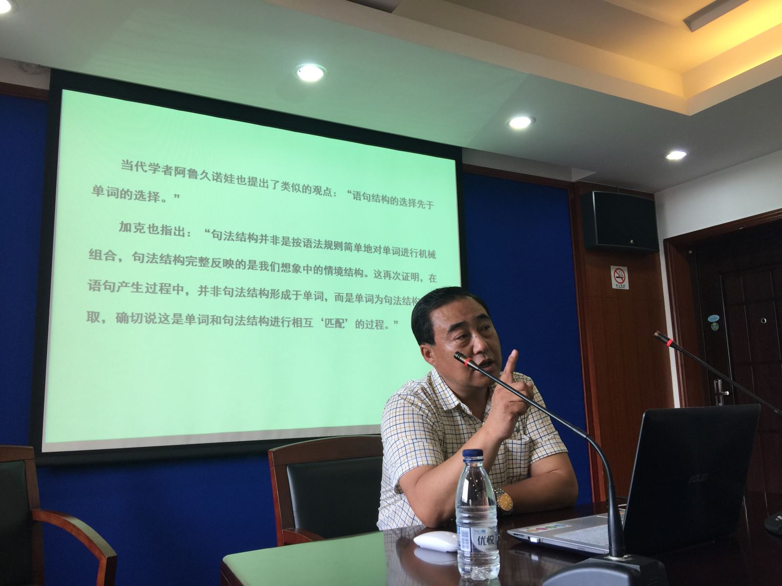 隋然教授首先由洪堡特、波捷布尼亚和魏斯格贝尔的语言哲学理论讲起,介绍了作为“中间世界”的语言。他指出,语言处在认识活动中两个主要角色—人和客体之间,它是第三个特殊的,独立的角色,语言具有创造世界的功能,也在人的认知活动中发挥着积极的作用。作为中间世界的语言具有这些主要特点:第一,“语言中间世界”不是由个人产生的,也不是整个人类产生的,而是由一个语言共同体产生的。第二,“语言中间世界”不仅仅是一种形态,更是一种过程。语言不以自身为目的,而始终作为一种塑造力渗透于人的行为之中。第三,“语言中间世界”不再把语言是客观反映形式还是主观认知形式的两极对立起来,而是把语言世界观看作某种人的主观意识与客观现实的结合。