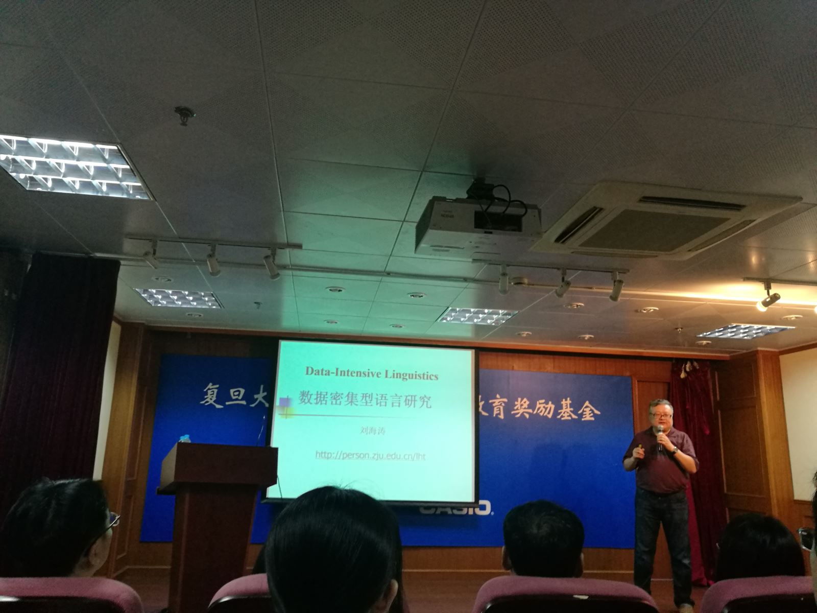 2017年9月26日,外文学院特邀浙江大学求是特聘教授、广东外语外贸大学云山领军学者、国家社科基金重大项目首席专家、国务院政府特殊津贴获得者刘海涛教授在文科楼209会议室做了题为“数据密集型语言研究”的报告。报告会由外文学院褚孝泉教授主持。会场座无虚席。
