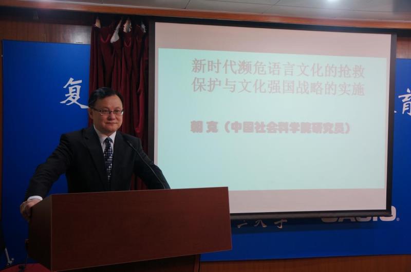 朝克教授先是将我国民族民间文化和民族文化历史性、多样性、丰富性和独特性的特点娓娓道来,随后具体阐述了对濒危语言文化抢救和保护工作的紧迫性、重要性和现实性。他指出,现今我国社会经济日新月异,科学技术对边远地区或曾远离现代文明的传统文化,包括他们的语言文字带来了致命的挑战,应将民族语言文字的抢救和保护作为一项长期的重要战略任务来重视。