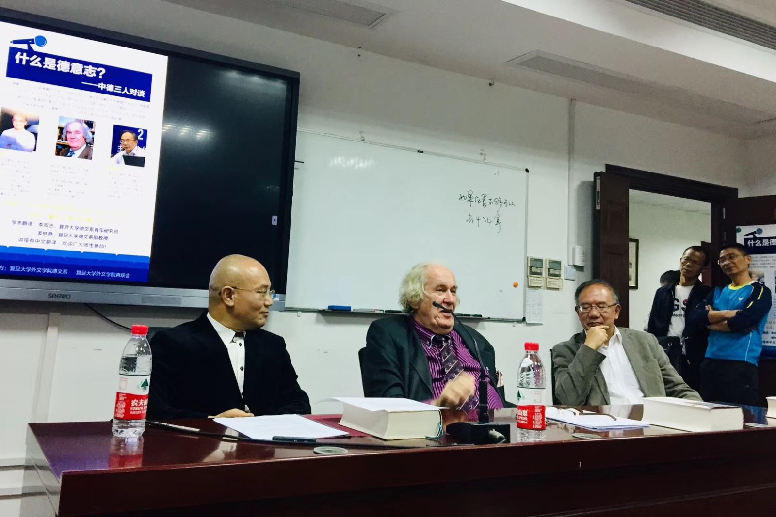 10月18日晚,由外文学院德文系和青联会合办的“‘什么是德意志?’——中德三人对谈”在文科楼510举行。参与对谈的三位德意志文化专家分为德国著名学者Dieter Borchmeyer教授、北京大学德文系主任黄燎宇教授、华体会官方网页版,华体会(中国)德文系主任魏育青教授,对谈内容则围绕Borchmeyer教授同名新作的核心论题,即“什么是德意志?”,从中德双边视角的历史现实两重维度展开,引起了参与师生的强烈兴趣。讲座由华体会官方网页版,华体会(中国)德文系青年研究员李双志老师及副教授姜林静老师共同担任学术翻译,进一步活跃了现场的学术讨论氛围。