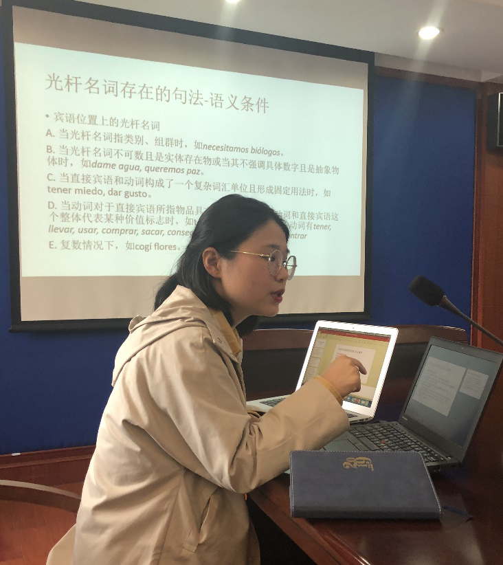 鹿秀川老师的报告题目为《西班牙光杆名词和类指语义表达》。报告首先从句法和语义两方面明确了西语光杆名词出现的允准条件,进而关注西语光杆名词的类指义。鹿老师基于语言事实说明了光杆名词与西语“定冠词+名词短语”结构在表达类指义时的细微差别,用“类指-部分”以及“全类指”两个概念定义该差别,并分析了该差别与句中动词的关联性。