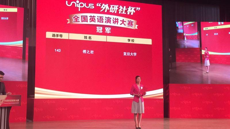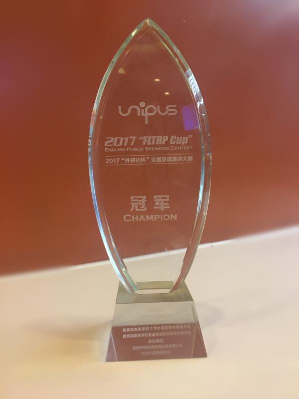 傅之君此次获得“外研社杯”全国英语演讲大赛全国总冠军,是继2008年施宇鹏夺得CCTV杯全国英语演讲大赛(外研社杯前身)全国总冠军之后,我校选手再次问鼎此项赛事的最高奖项。“外研社杯” 全国英语演讲大赛是我国规模最大、级别最高、竞争最激烈的全国英语演讲赛事,今年的报名首次同时面向在中国留学的外国选手,来自英、美、加拿大等英语母语的选手也参加了大赛,我校选手在整体上获得如此优异成绩,实属不易。