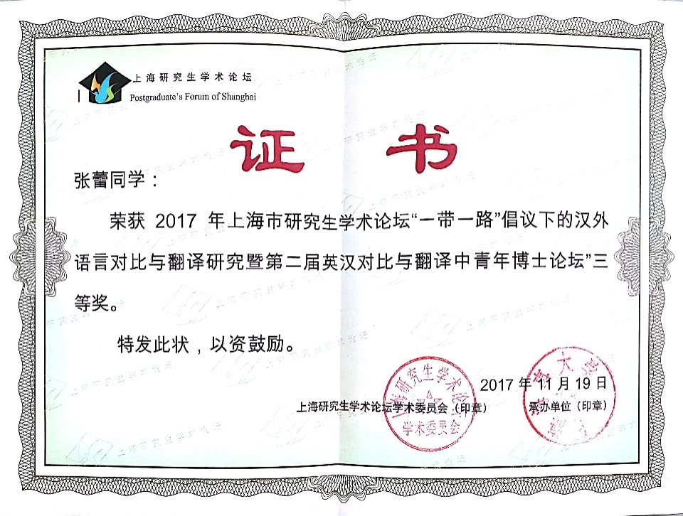 2017年11月17-19日,在上海海事大学举办的“2017年上海市研究生学术论坛”(“一带一路”倡议下的汉外对比与翻译研究暨第二届英汉对比与翻译中青年博士论坛)中,我校外文学院韩文系博士研究生张蕾同学(姜宝有教授指导)荣获三等奖。此次论坛由上海市学位委员会办公室主办、上海海事大学研究生院与上海海事大学外国语学院承办、《上海翻译》编辑部协办。中国英汉语比较研究会名誉会长、华东师范大学终身教授潘文国教授、上海外国语大学许余龙教授、北京师范大学周流溪教授、华体会官方网页版,华体会(中国)陶友兰教授、上海交通大学胡开宝教授等知名学者出席了此次会议。来自伦敦大学、香港理工大学、北京外国语大学等44所海内外高校的46位中青年博士及硕士研究生在会上宣读论文并进行讨论。