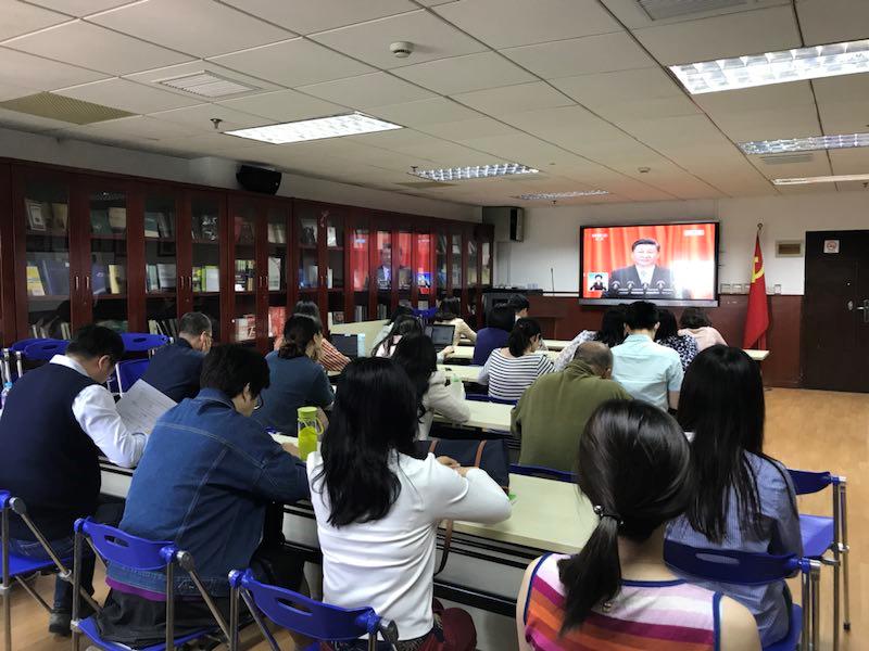 5月4日上午10:00,外文学院党委组织师生党员在文科楼424会议室集中收看纪念马克思诞辰200周年大会,认真聆听习近平总书记在纪念大会上的重要讲话。学院党委书记罗英华、党委委员、部分教师和学生党员共同收看直播。