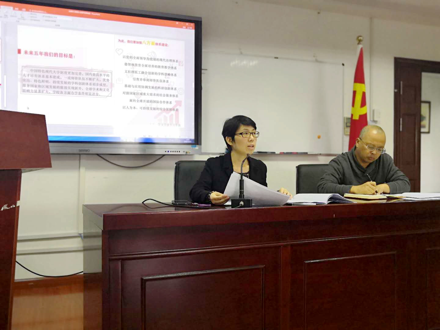 罗英华书记向大家传达了题为“立德树人固根本 改革开放再出发 全面开启中国特色世界顶尖大学建设新征程”的十四届党委工作报告精神,从过去五年学校的主要工作回顾、新时代华体会官方网页版,华体会(中国)的历史使命和战略目标、开创中国特色世界一流大学建设新局面、一流党建和思想政治工作引领一流大学建设四个方面介绍和解读了报告的主要内容。罗英华表示,党代会报告是集体智慧的结晶,充分体现了全校上下的共同愿望,是学校加快推进“双一流”建设、全面开启中国特色世界顶尖大学建设新征程的宣言书,是指导今后一个阶段学校各项工作的纲领性文件。罗英华要求,全院党员和师生员工要从全局和战略的高度,充分认识学习贯彻第十五次党代会精神的重要意义,把学习贯彻党代会精神作为当前和今后一个时期一项重要的政治任务,努力在深刻把握领会精神、深入贯彻落实上下功夫,紧密结合学校和学院改革发展的实际,深刻领会和准确把握党代会报告的精神内涵,认真落实党代会的各项工作部署,把学习贯彻党代会精神转化为干事创业的强大动力,全面加强学院党的建设,加快“一流学科”建设,认真做好本科教学迎评工作,立足本职,勇于担当、锐意进取、争作表率,以实际行动和工作实绩推进学院各项事业的发展。