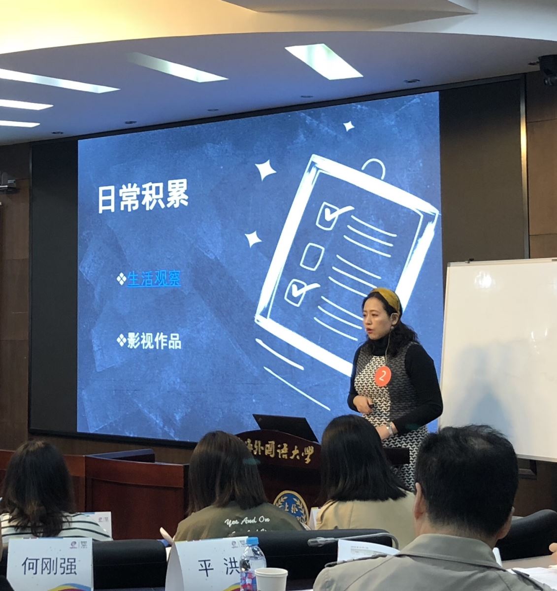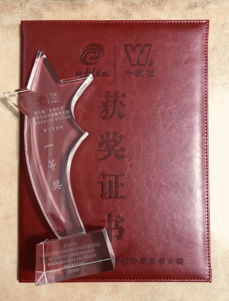 初赛形式为提交选手个人20分钟的授课视频,冯老师选取了“口译实战中的信、达、雅”进行展示,从全国各地近百所高校参赛选手的参赛视频中脱颖而出,并在复赛中获得网络评选和专家评审青睐,最终进入全国16强决赛。全国决赛的评委阵容强大,翻译专业组更是汇集10位顶级专家。决赛内容为针对指定教材进行20分钟的授课展示和5分钟现场问答,冯老师的精心设计,尤其是与学生的现场精彩互动,顺利晋级最后的全国8强总决赛。全国总决赛每位选手只有30分钟的临场准备时间,冯老师凭借丰富的口译实践,在10分钟的说课环节中设计了一堂模拟会议课,并配以PPT展示,条理清晰地展示了教学逻辑和教学步骤,并出色回答了评委的问题,最终斩获一等奖。