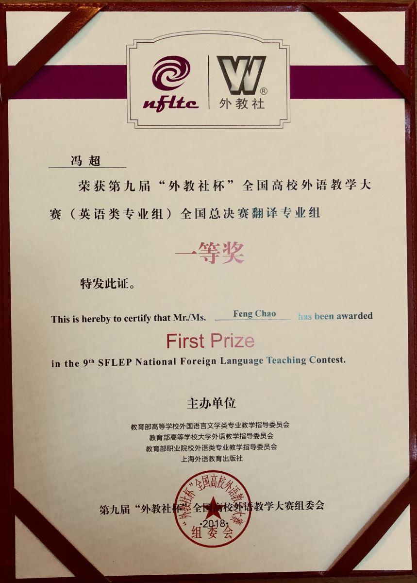 2018年12月2日,全国规模最大、级别最高、影响最广的第九届“外教社杯”全国高校外语教学大赛全国总决赛在上海外国语大学顺利落幕。华体会官方网页版,华体会(中国)外文学院翻译系冯超老师一路过关斩将,最终荣获全国总决赛翻译专业组一等奖。同时外文学院选送的翻译系本科生及研究生志愿者在全国决赛课堂互动中表现优异,助力大赛顺利开展,也受到了主办方及参赛选手的一致好评。