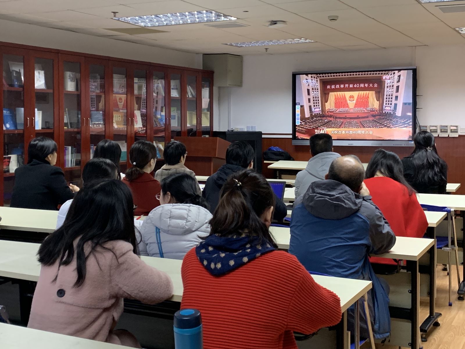12月18日上午10:00,中共中央、国务院隆重召开庆祝改革开放40周年大会。外文学院分党委组织师生收看大会直播,学院分党委书记罗英华、分党委委员、教师代表在文科楼424会议室集体收看,部分师生到光华楼102报告厅参加学校组织的集体收看,其他师生也通过各种渠道收看学习。