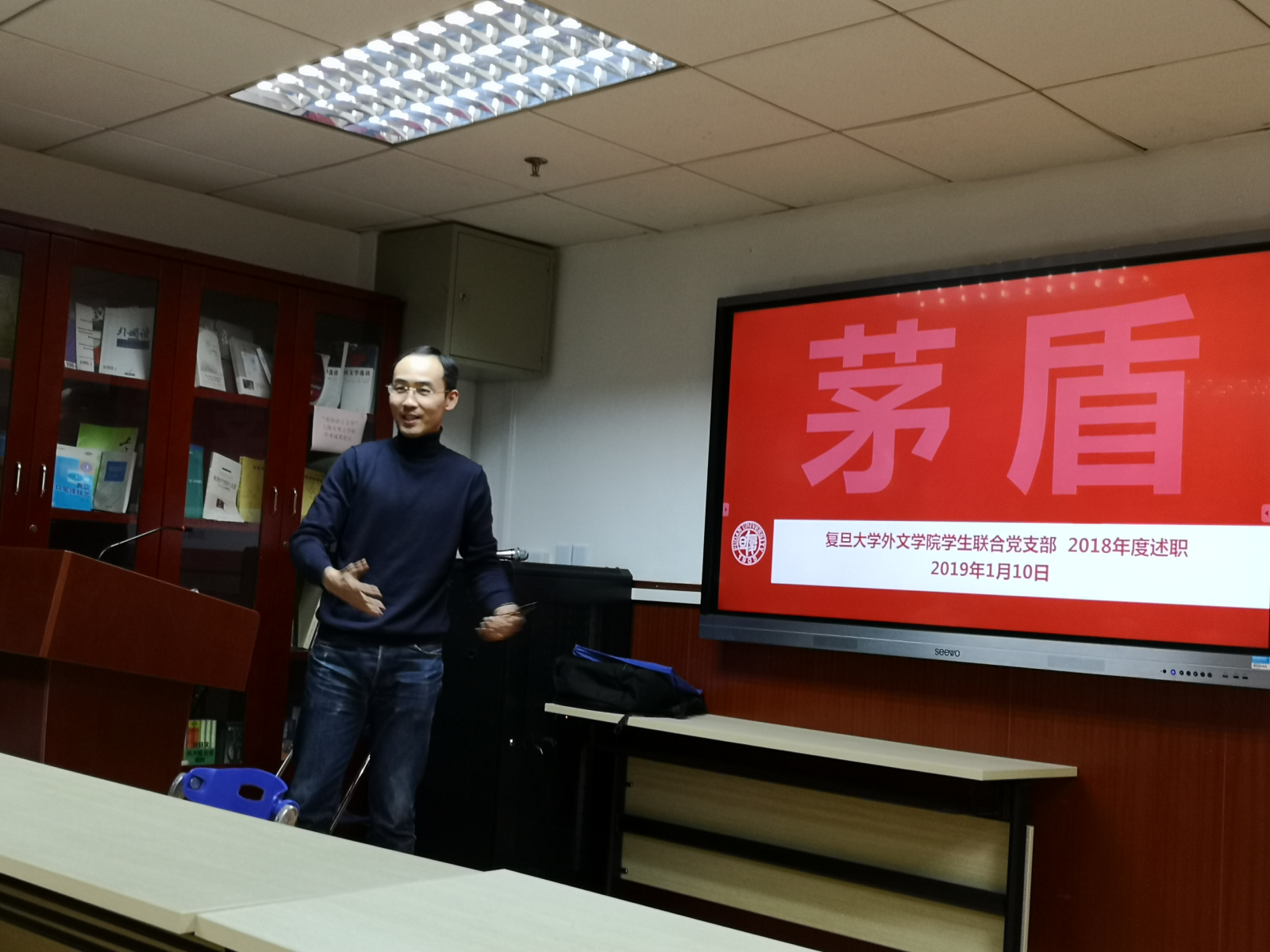 2019年1月10日下午,外文学院学生党总支在文科楼424会议室举行学生党支部书记年度述职会。外文学院党委书记罗英华,党委副书记、学生党总支书记赵昕,学生党总支副书记王亚鹏、茅盾,学生党支部书记、部分辅导员等参加述职会。