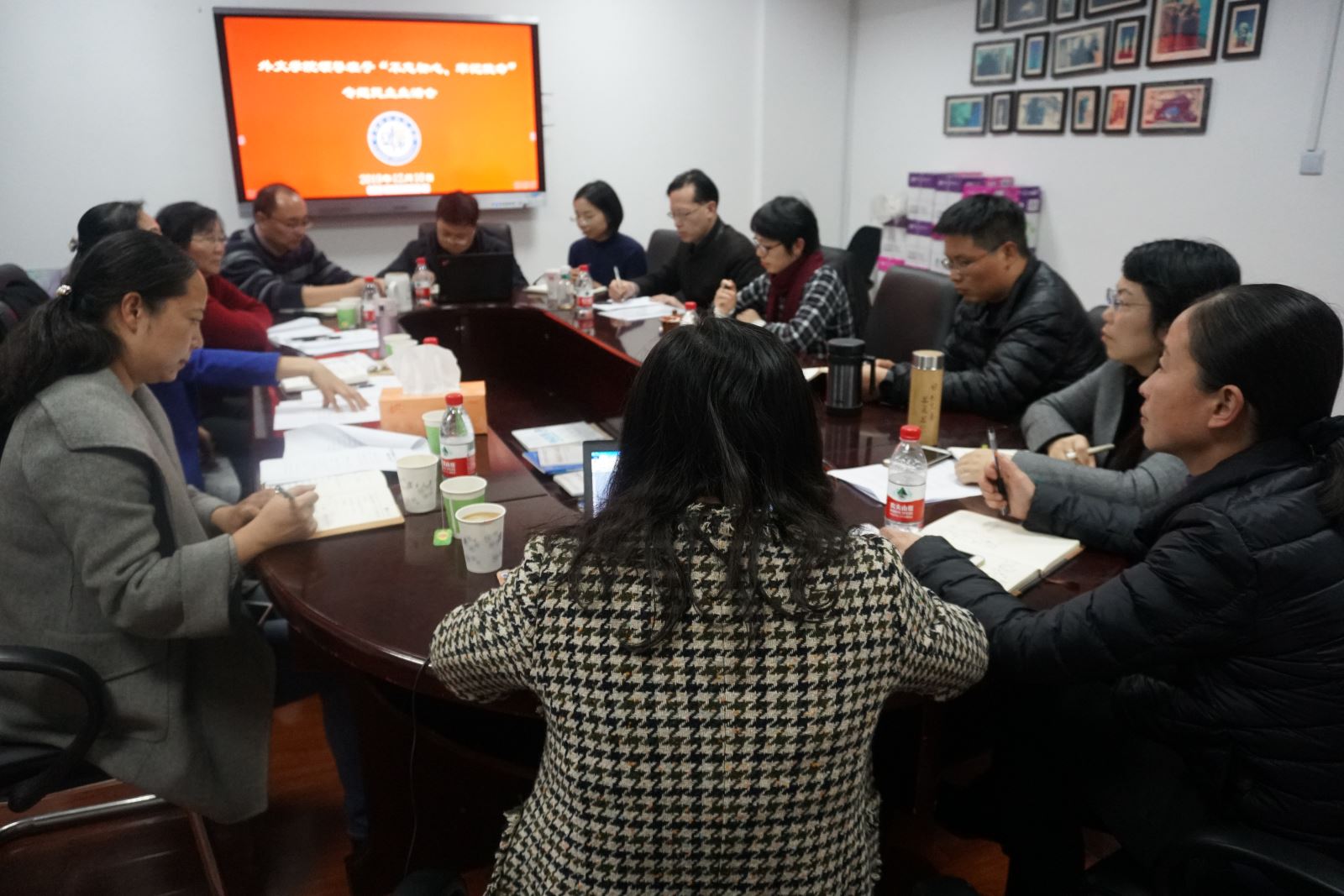 外文学院党委对本次专题民主生活会高度重视,会前做了充分准备。在“不忘初心、牢记使命”主题教育中通过个人自学与集体研讨相结合的方式,深入学习习近平新时代中国特色社会主义思想特别是习近平总书记关于教育的重要论述,跟进学习党的十九届四中全会精神,先后组织党政领导班子开展了7次集中研讨、1场专家报告、2次参观学习。通过个别访谈、设立意见箱、召开座谈会等多种方式广泛听取师生意见建议, 先后召开7场座谈会,梳理了30余条问题。按照民主生活会的要求,根据“四个对照”、“四个找一找”,学院党政主要领导与班子成员,领导班子成员之间,开展了谈心谈话,交换意见,指出不足,提出建议。在此基础上,罗英华主持了领导班子检视剖析材料的撰写工作,班子成员认真撰写了个人检视剖析材料。