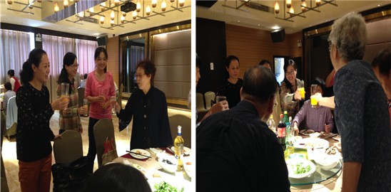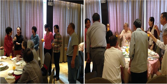 11:30,活动正式开始。参加此次敬老节活动的院领导有外文学院党委书记李倩、副书记曾建彬、副院长季佩英。李倩老师首先致祝酒词,向老前辈、老同志们致以真挚、热情的节日祝贺,并祝大家身体健康、幸福美满。她讲到学校、学院对退管工作非常重视,对退休教师们非常关心,欢迎大家常回学院走走看看,如遇到什么困难可以找学院帮忙。接着她又简要地向大家通报了学院近期的工作发展情况。教师们在各自的研究领域都取得了不小的成果。学生出国交流项目增多,很多同学都有机会出国到母语国家提高语言能力。老教师们听了都非常振奋,频频鼓掌,为学院事业的蓬勃发展而高兴。最后,她提议大家共同举杯祝愿老前辈、老同志们永远健康,永远开心。