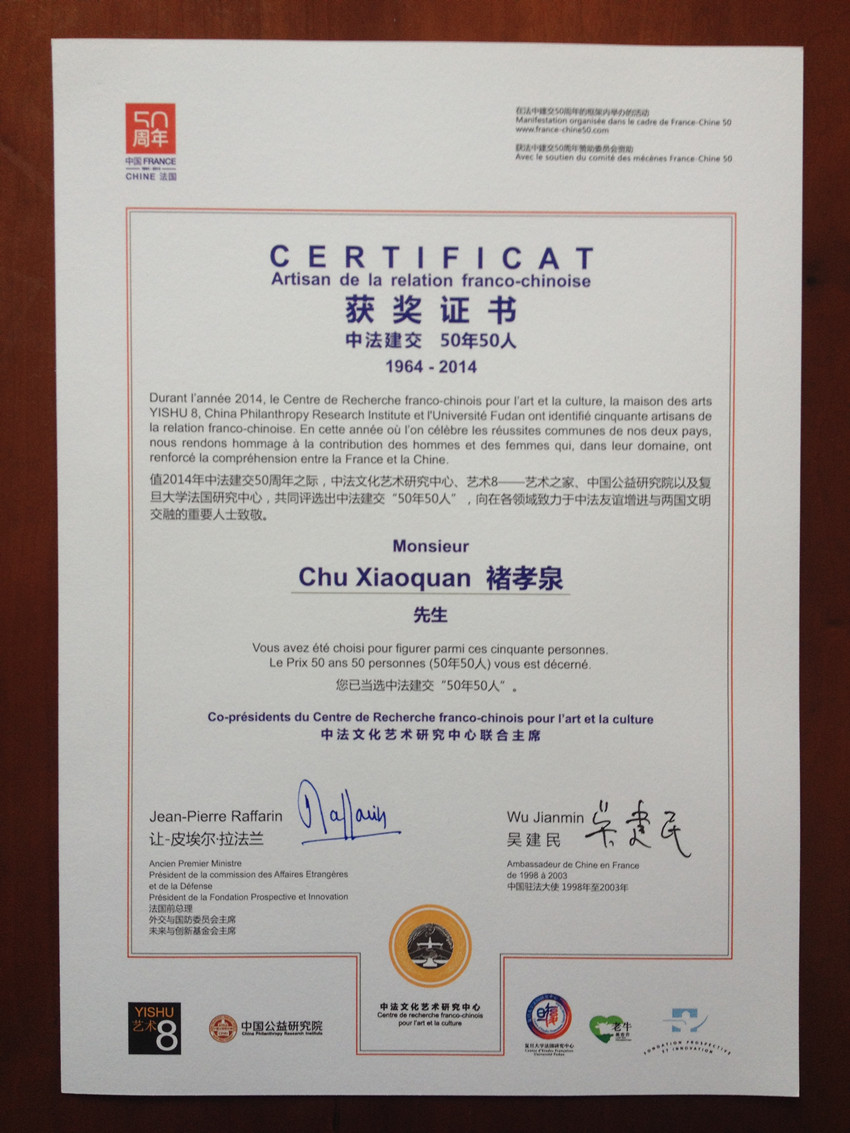 10月28日,在北京艺术8(原中法大学旧址)内,前法国总理拉法兰和中国前驻法大使吴建民共同宣布了中法建交“50年50人”最终名单,华体会官方网页版,华体会(中国)外文学院法文系教授褚孝泉位列其中。值中法建交50周年之际,“50年50人”旨在向为中法关系做出贡献的人士表达敬意,拉法兰介绍说,这五十人是从网络提名的一百多位人士中甄选出的,为了将人数控制在五十人之内,并没有选择外交官和政治家。“正如法国作家安德烈-马尔罗所说,对生命来说最重要的是在世间留下足迹,我们选出的也是在中法关系中留下显着印记的人。”(转自新华网)