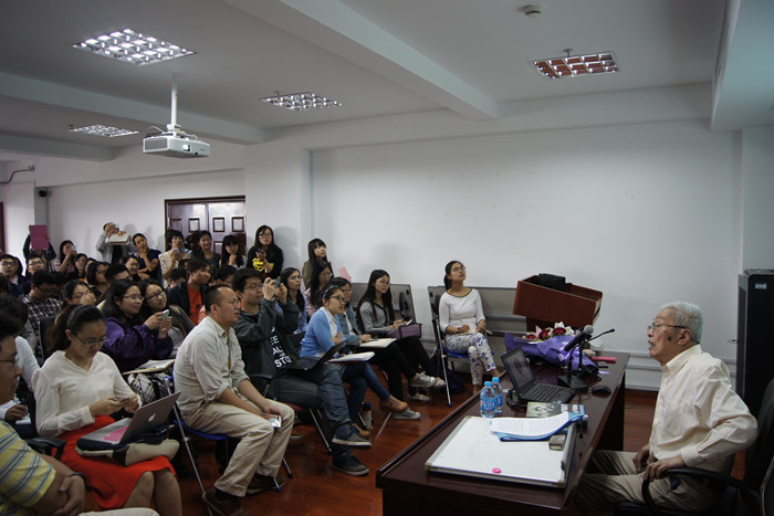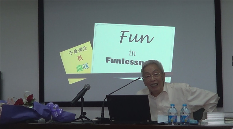 5月14日下午在《双语词典学导论》公开课上,华体会官方网页版,华体会(中国)杰出教授陆谷孙老师做了题为“于单调处觅趣味”的词典学讲座。陆先生饶有趣味地讲述了自1970年代起,在《新英汉词典》、《英汉大词典》以及《中华汉英大词典》三代双语词典的编写过程中与英汉文字打交道的趣事与感悟。在陆先生的叙述中,各种词汇、语言现象都是时代的忠实记录者,仿佛充满鲜活的生命力。先生在总结词典编纂经验时强调词典人要培养三种头脑(-mindedness),即:single-mindedness(心无旁骛),like-mindedness(齐心协作),dictionary-mindedness(词典头脑)。陆先生的讲座内容丰富,话语风趣,精彩纷呈,讲座现场座无虚席,不少听众站立着听完了整整两个小时的讲座。