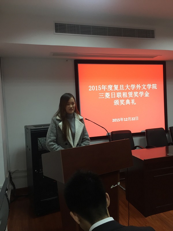 典礼开始后,三菱日联融资租赁有限公司人事部副部长中村圭吾先生、三菱日联中国有限公司董事长兼总经理富永修先生及外文学院李倩书记、邹波系主任分别致辞,回顾了双方历年的友好合作,表达了对学子们的殷切期望;随后三菱日联融资租赁有限公司的短片介绍了其商业领域及全球影响,也为在场同学们提供了开阔的就业思路;而后中村圭吾先生为六名获奖学生颁发了荣誉证书,表达了自己的美好祝愿,各位代表也与获奖同学集体合影留念;颁发证书之后,13级日文系蒋宁同学代表获奖学生发言,表达了感谢和敬意以及坚定努力的决心。典礼在融洽的氛围中落下帷幕。