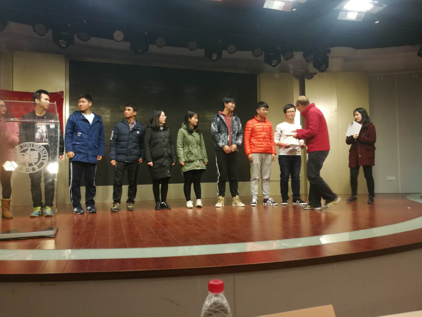 在学员英语能力展示环节,设置了听力游戏、单词游戏和学员节目展示三个部分。在听力游戏中,大家一起参与了歌词填空和新闻听写。在单词游戏中,学员被分为八组,每组派出两名代表上台参加,其他同学则在场下参与游戏。经过一个月的集训,游戏环节对于学员们来说已经不在话下,现场抢答激烈,游戏节奏紧凑,气氛活跃热烈。