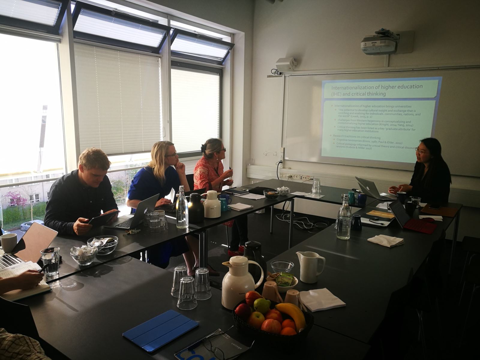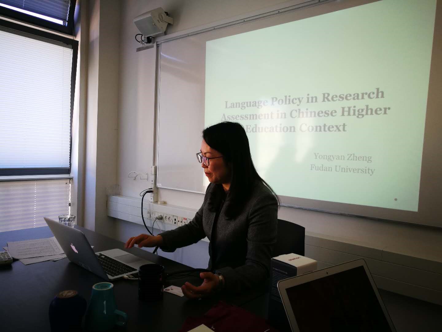 郑咏滟教授首先全面介绍了创新团队的成员、研究课题与先期成果,也同时介绍了外文学院多语种中心的课程设置、不同语种的选课情况等。哥本哈根大学国际化与平行语言使用中心主任Anne Holmen教授接着介绍了该中心的成员、科研概况和中心在学校发展中的作用。双方就高等教育国际化背景下的多语语言使用与教育政策等议题开展为期两天的学术研讨,并就中丹两国共同面临的多语挑战展开热烈讨论,具体包括英语作为强势学术语言对教师学术发展的影响、国际招生的语言标准和多语工作环境中的语言使用与语言管理等。Anne Holmen教授对我方研究报以浓厚的兴趣,并表达了进一步开展后续交流与合作的意愿。