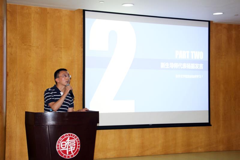 法文系杨振老师代表新生导师发言。杨老师寄语新生要充分利用校内丰富的学习资源和第二课堂活动,培养对人生通达的态度、对个体的尊重和关怀,关注国家和社会发展,提升自身的综合人文素养。