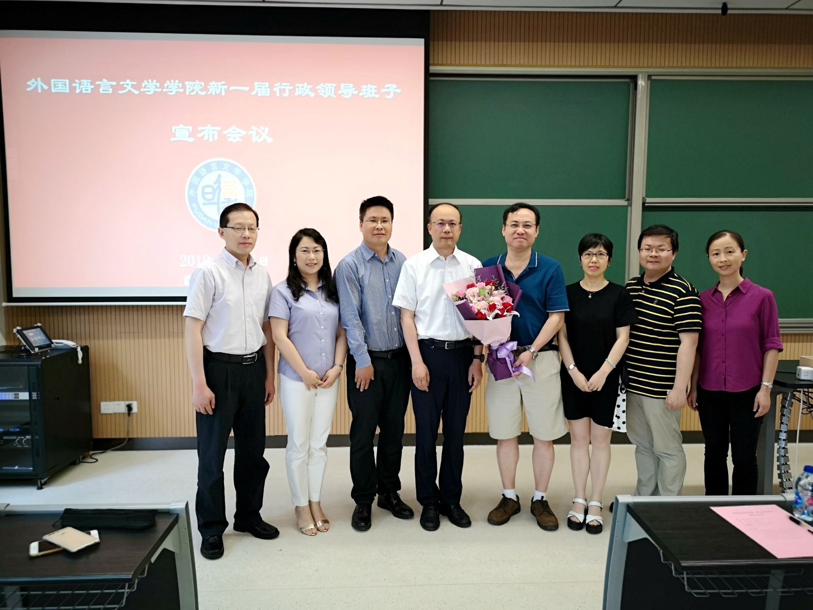 2019年7月4日下午,外文学院在第六教学楼6112教室召开全院教师大会,宣布新一届行政领导班子。学院党委书记罗英华主持会议,校党委常委、副校长陈志敏、校党委组织部副部长陈莉出席会议,学院全体教职员工参加会议。